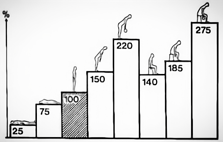 Dr. Alf Nachemson是背痛研究領域中數一數二的重量級人物,而這一張正是來自於他1964年的一篇研究。由這一篇研究他發現了以站姿lumbar椎間盤的壓力為基準,坐姿椎間盤的壓力高出站姿40%,以及其它有腰椎flexion的姿勢甚至高達站姿壓力的2.75倍!在這一篇的結論中,Dr. Nachemson 提到這研究的數據有助於解釋為什麼有下背痛的人坐著會比站著痛。